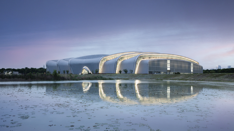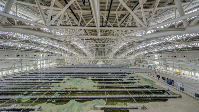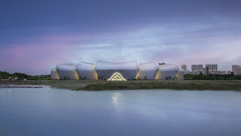 “贝壳”造型的太湖试验厅外轮廓166米*150米,建筑面积24000平方米,中间没有一根立柱,可以轻松容纳两片标准足球场,或并排放置两架空客A380客机,由上海江欢成(院士)建筑设计有限公司设计。太湖试验厅“骨骼”由八榀落地斜桁架组成,“表皮”由七片金属外壳层叠展开,高低交错,室内八条“井字型”马道可空中俯瞰太湖。高窗将日光与空气引入室内,似生物可呼吸式皮肤。太阳光经反射、漫射后进入室内,形成柔和均匀光环境。天窗拔风通风,强化室内外空气对流交换,降低建筑能耗,构建起建筑与外环境交融共生关系。太湖试验厅工程先后获得浙江省钢结构金刚奖、中国钢结构金奖工程、首届全国水利行业BIM应用大赛铜奖。